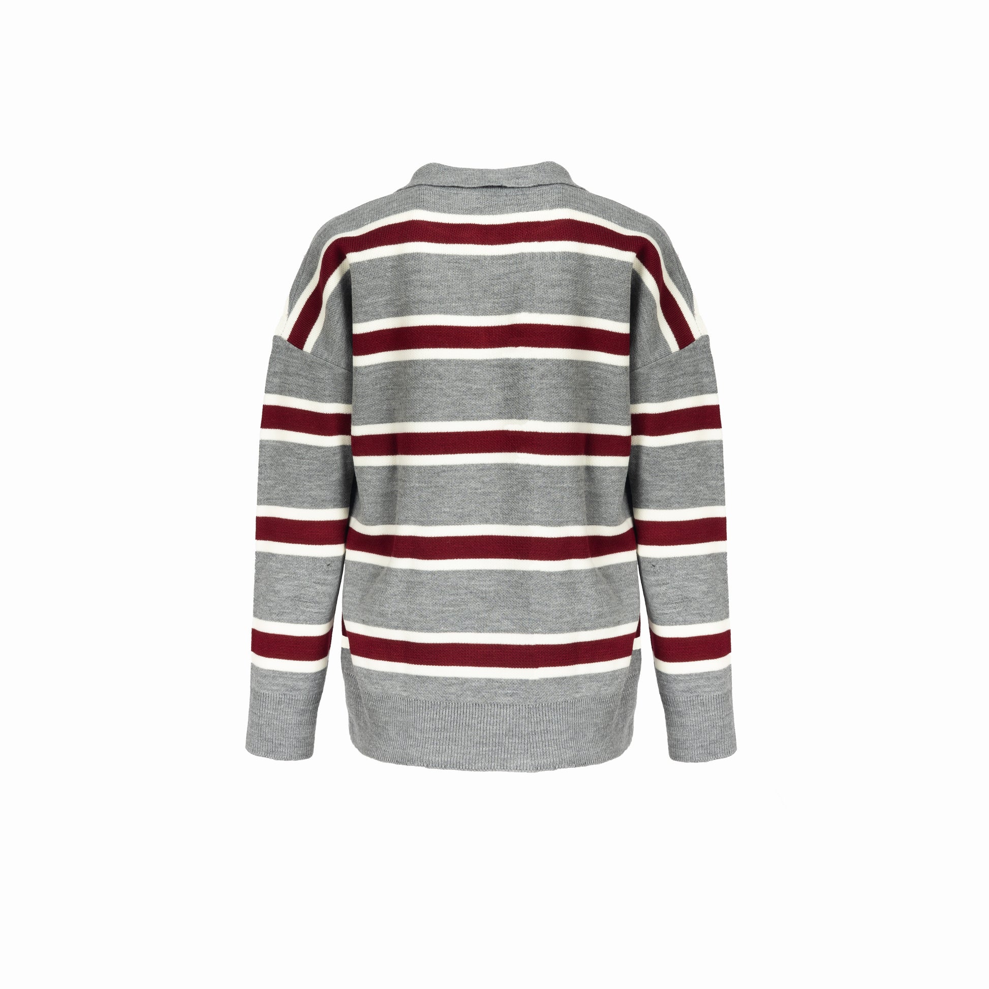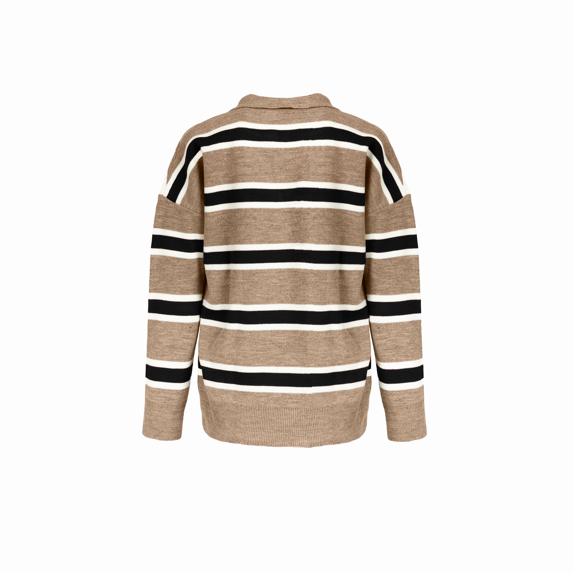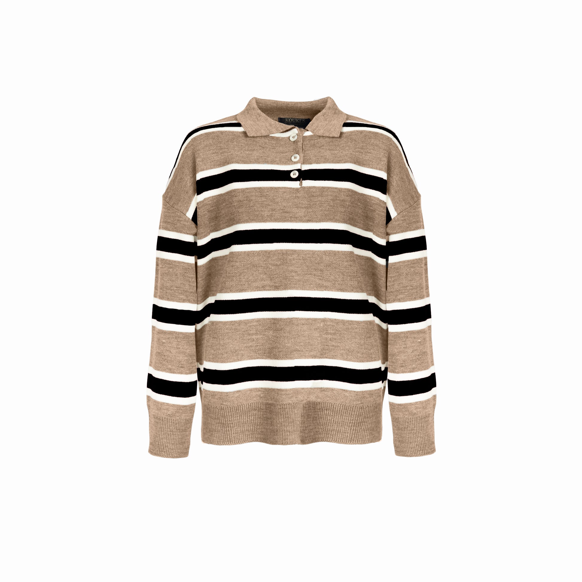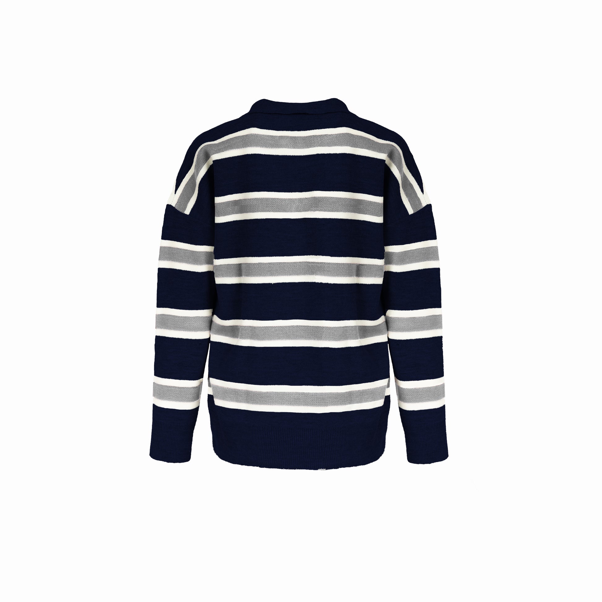 Pull polo rayé pour femme en laine douce, alliant confort et élégance. Son col polo boutonné et sa coupe confortable en font une pièce intemporelle, parfaite pour un look casual chic au quotidien.